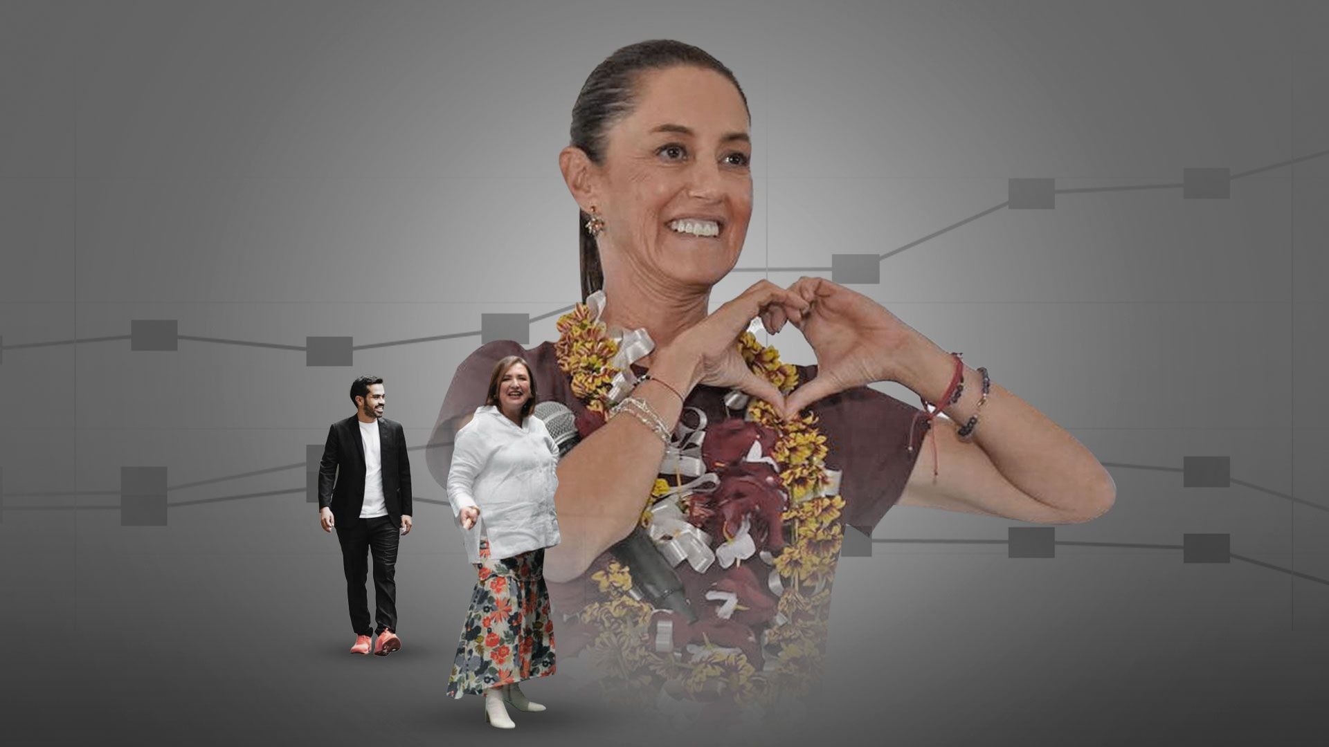 Según las encuestas, Claudia Sheinbaum Pardo, de la coalición Sigamos Haciendo Historia, conformada por los partidos Morena, PT y PVEM, es quien lleva ventaja sobre Xochitl Gálvez de la coalición Fuerza y Corazón por México (PRI-PAN-PRD) y Jorge Álvarez Máynez, de Movimiento Ciudadano (MC).